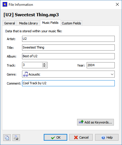 View and edit the music tags embedded in MP3 and WMA files, such as artist, song title and musical genre. Use the tags to batch rename your music files or automatically add them as keywords for rapid categorization and searching of your collection