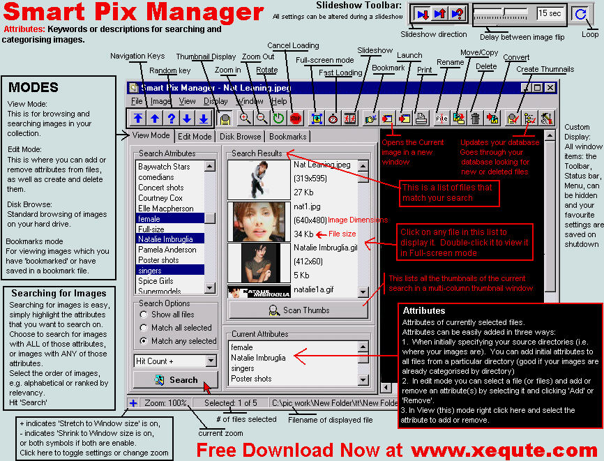 This is one of the most useful image viewers that I have come across. You can browse thumbnails, view as a slideshow or simply select which ones you wish to view (including Zoom facilities). You can also let it select a random picture from the current directory. The program allows you to cancel the loading of a picture or load the pictures in the background. You can easily convert the selected image to JPG or BMP, and even rename the files so they have a .dll extension so people can't easily view them. Smart Pix Manager also allows you to password the program to stop prying eyes. Xequte Software have outdone themselves with Smart Pix Manager, well worth the $26.00 asking price. |
